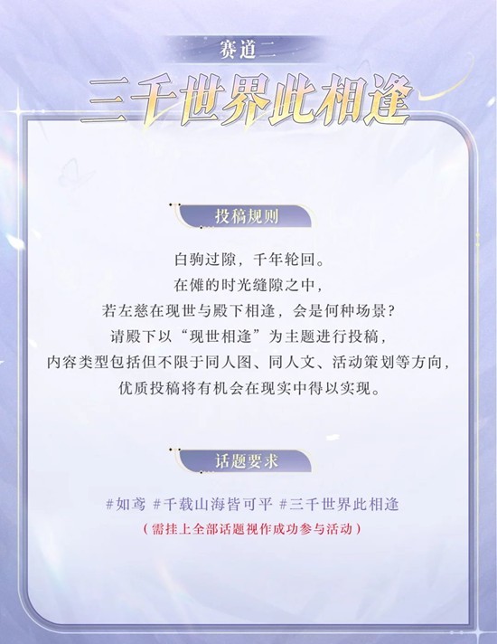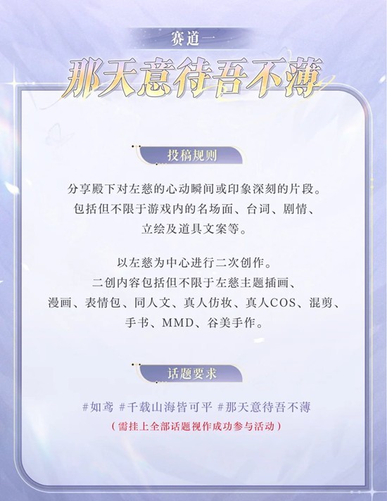 参与方式:围绕 “那天意待吾不薄”、“三千世界此相逢”两大赛道,根据具体赛道要求携带全部话题发布,即可参与活动。