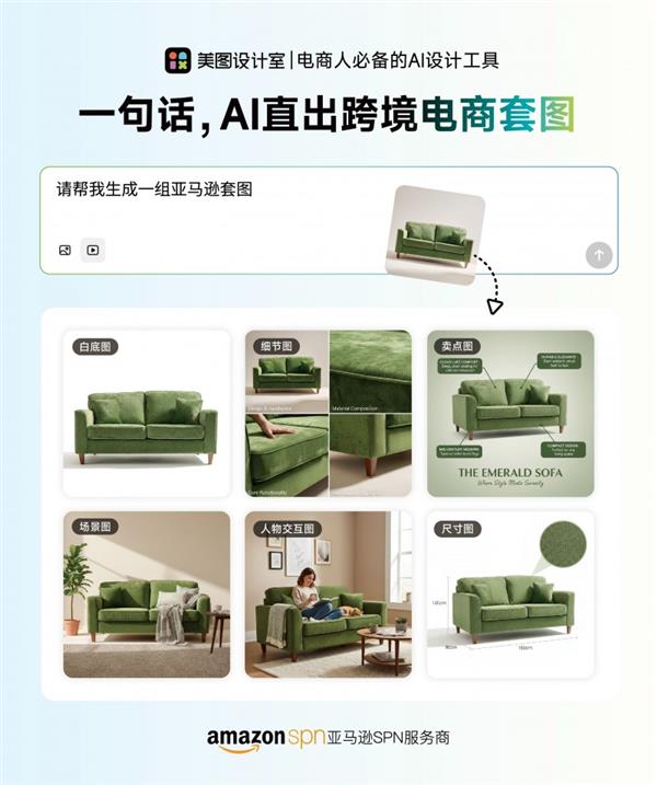 据介绍,作为懂电商的AI设计工具,美图设计室AI设计Agent可以精准理解套图、A+详情图、上身图、手持图、人物互动图等复杂需求,涵盖场景融合、光影优化、卖点标注全流程。卖家只需输入“生成亚马逊产品套图,AI Agent便能精准理解需求,快速输出包含白底图、细节图、卖点图、场景图、人物场景图、尺寸图等符合平台规范的图片。