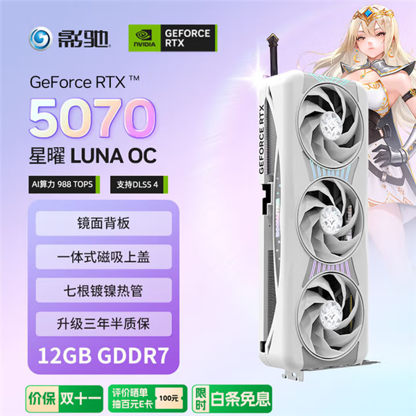 影驰RTX 5070星曜OC系列——星曜显卡作为影驰旗下的“明星”单品,以二次元角色“星曜娘”为设计灵感,提供了纯白的LUNA(月之女神)和纯黑的NOX(黑夜女神)两种配色,下放至RTX 5070的她们不仅拥有强劲的性能,其所引入的磁吸散热上盖和镜面背板设计,也为玩家提供了更多的可玩性。