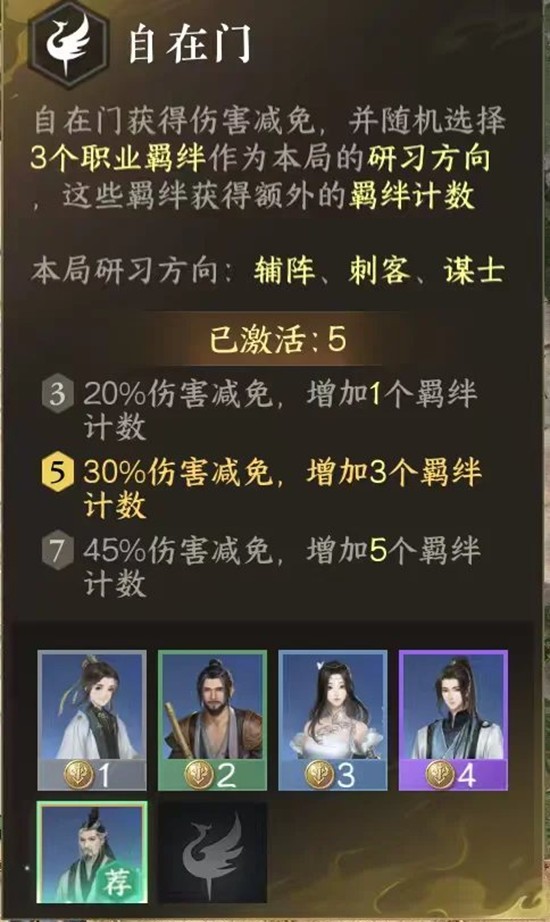 3.自在门的强度在于叶问舟师兄刷出来之后,比如有此时可以通过上三自在+一刺客+一谋士+一辅阵构成拼多多阵容(具体看本场专研的是哪三项)有一把一星师兄+回元+刺客打出了不俗的伤害就是启动慢了点。