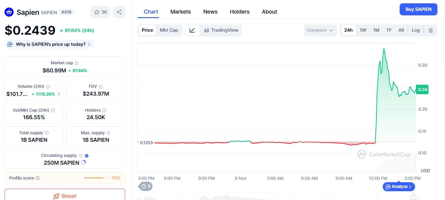 SAPIEN 股价达到 0.2439 美元,过去 24 小时内上涨 97.64%。SAPIEN 交易量为 1.017 亿美元,市值为 6099 万美元。