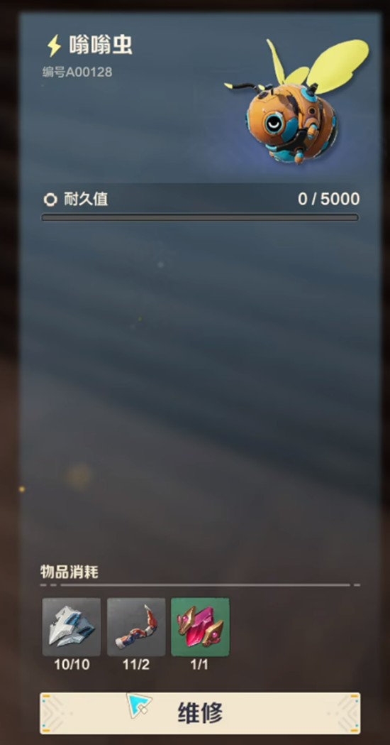 以常见的采集型玛卡“嗡嗡虫”为例,当其耐久耗尽后,玩家需准备基础矿石、废弃铁料和金属矿物等材料进行修复。这些材料在日常探索和家园生产中较为常见,建议提前储备。材料齐备后,在玛卡维修界面点击“维修”按钮即可完成操作,修复后的嗡嗡虫将恢复采蜜功能。