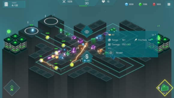 十字防守采用简洁现代的3D赛博朋克风格,金属质感场景搭配流线型炮台设计与霓虹光影效果,呈现出浓厚的科幻氛围。其核心机制基于随机建造与合并系统,玩家利用初始资源搭建基础炮台,并通过合并两个相同等级与类型的塔,随机生成更高级别的防御单位。