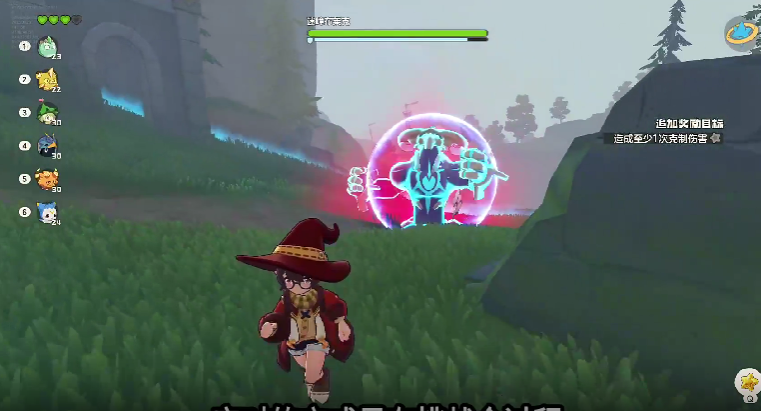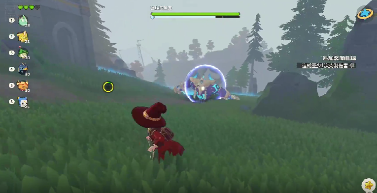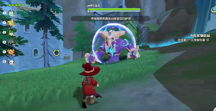 第二种技能为原地拍击地面,只要玩家远离中心范围即可避免伤害。此时可利用星星魔法集中火力打破其护盾防御。第三种技能为地面突刺,具有明显预警提示——出现粉红色光效及三个黄色圆形判定区。推荐向右侧方向冲刺以规避伤害。成功破盾后,即可对BOSS本体展开持续输出。当血量降至50%以下时,战斗进入第二阶段,属性转为地系主导。