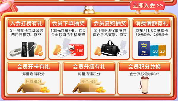 粉丝会员福利更多,如果还不是会员就赶紧加入金士顿大家庭!活动期间入会打榜有机会获得金士顿批头工具套装、两用开箱刀等;会员下单还能抽100元京东E卡、手机支架等;会员复购还有机会抽金士顿FURY健身包等;消费满额则有京东会员年卡、京东E卡等好礼;会员积分还可兑换限量版的金士顿双饮咖啡杯;更多福利还不赶紧来看看。