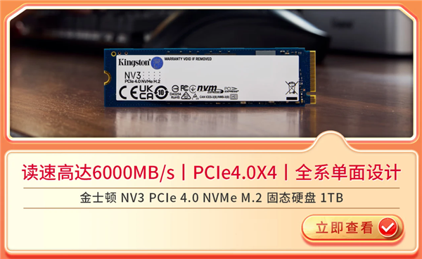 金士顿NV3 PCIe 4.0 NVMe M.2固态硬盘的杀手锏就是性价比,1TB版本的读写速度高达6000MB/s和4000MB/s,采用单面设计适合轻薄型笔记本电脑或者小型电脑使用。NV3固态硬盘不仅有金士顿的“金”字招牌为品质保驾护航,亲民的价格让绝大多数用户可以没有负担的体验PCIe 4.0x4高速固态硬盘带来的整机性能提升。