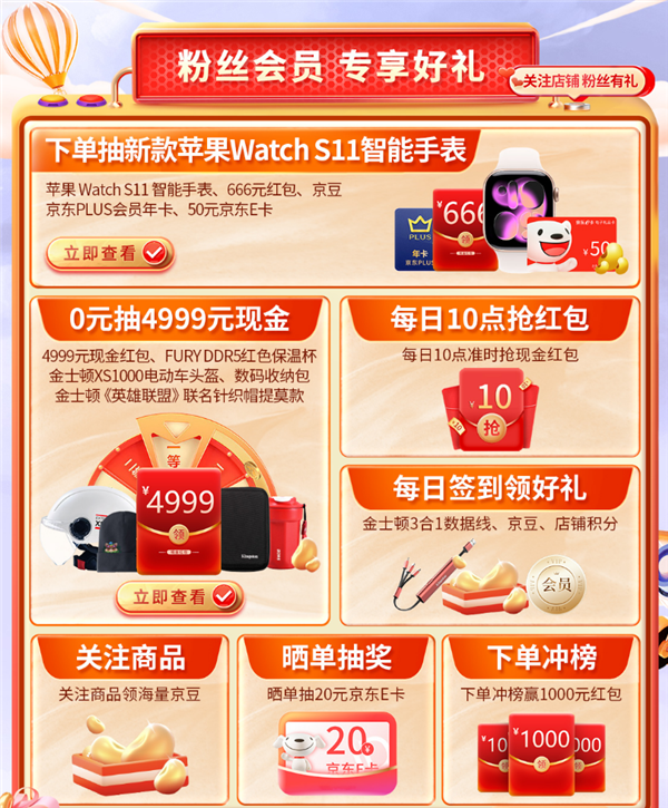 活动期间在金士顿京东自营旗舰店下单的用户可以参与抽新款苹果Watch S11智能手表的活动,此外还有666元红包、京东PLUS会员年卡、50元京东E卡等众多好礼;下单冲榜的用户,至高可赢十万京豆。不购物也没关系,来金士顿活动页面,就可以参与0元抽活动,4999元现金红包、金士顿XS1000电动车头盔、FURY DDR5红色保温杯、金士顿《英雄联盟》联名针织帽提莫款、金士顿数码收纳包等精美大礼应有尽有。如此众多的天降福利还不赶紧来试试自己的好运气!(奖品数量有限,先到先得,送完为止!)