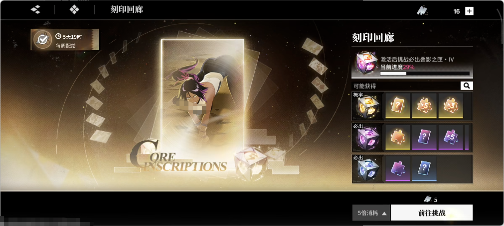 刻意回廊里会掉落相关碎片,供大家合成之外,有的时候也会有概率直接掉落成品角色刻印,无需大家合成,而且该回廊挑战还有保底的机制,每次挑战的时候都会累计叠加叠影之匣的进度,累积完毕之后,下一次挑战大家就可以获得一张角色的专属刻印了,不过这张刻印是在现有角色里随机抽的,大家无法指定奖励。