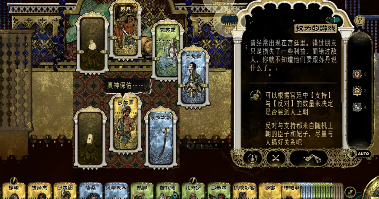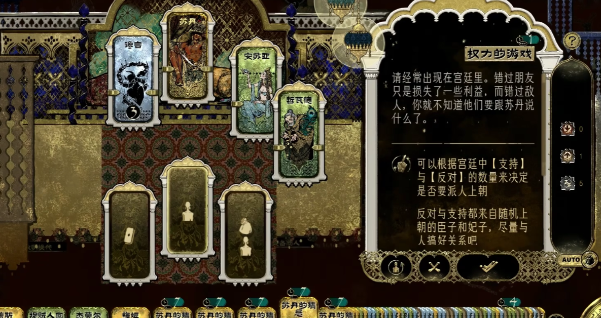 其一是解锁金色宠妃莎姬的任务线。一旦完成全部“莎姬任务”,玩家即可开启皇宫密道。此后只要莎姬存活于队伍中,朝堂上便不会再生成新的猜忌卡,实现根本性规避。