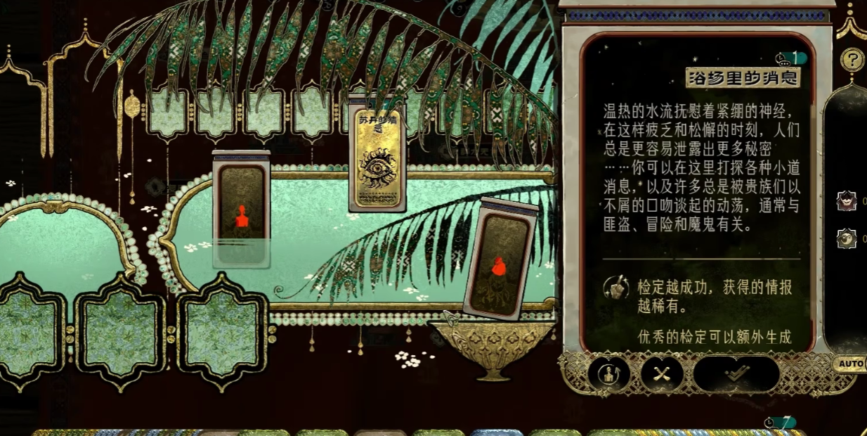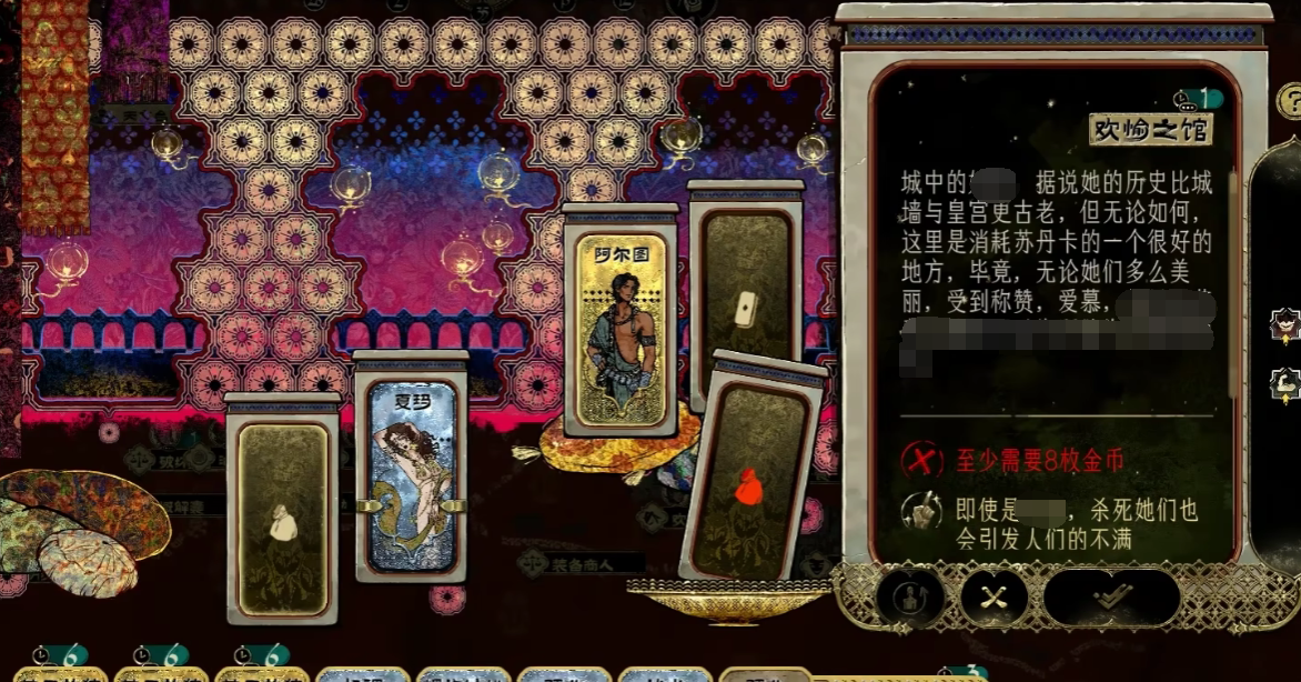 第二种方式发生在欢愉之馆场景中。玩家若在此地拒绝女性角色的邀约,便可直接清除一张猜忌卡。不过,这一选择会导致不利传闻扩散,同时限制欢愉之馆的功能开放。特别需要注意的是,一旦后续获得白银品质或更高的纵欲类卡牌,将无法正常处理相关事件。