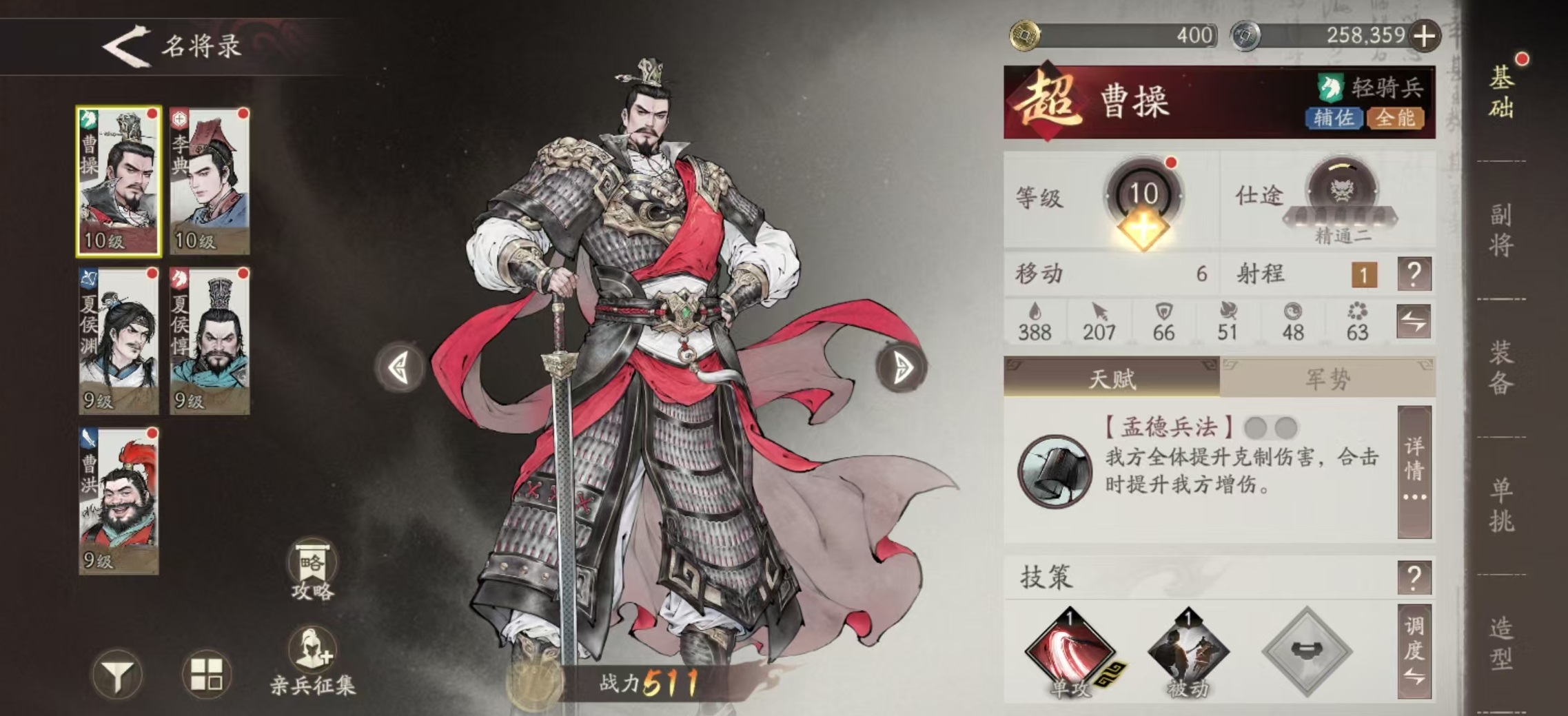 然后就到了武将培养的环节,武将主要通过抽卡等方式来获取,在特殊池子中,关羽和张飞的强度非常高,所以很推荐大家去抽特殊池。只要能够拿到关羽或者是张飞,前期的绝大多数战斗都会非常简单。另外主线剧情的单挑环节,日常任务和部分支线任务或者是在路上开启的箱子,都有可能获得武将碎片。前期应该重点培养曹操、夏侯敦、关羽、张飞、张辽等武将。曹操可以提供全队增益效果,夏侯敦是很出色的前排坦克,关羽的单体爆发高,张辽是骑兵核心。在培养时,优先提升核心武将的星级,目前游戏中武将的最高星级是10星。升星之后,可大幅度增强天赋属性和技能威力,是游戏中战力提升最明显的方面。
