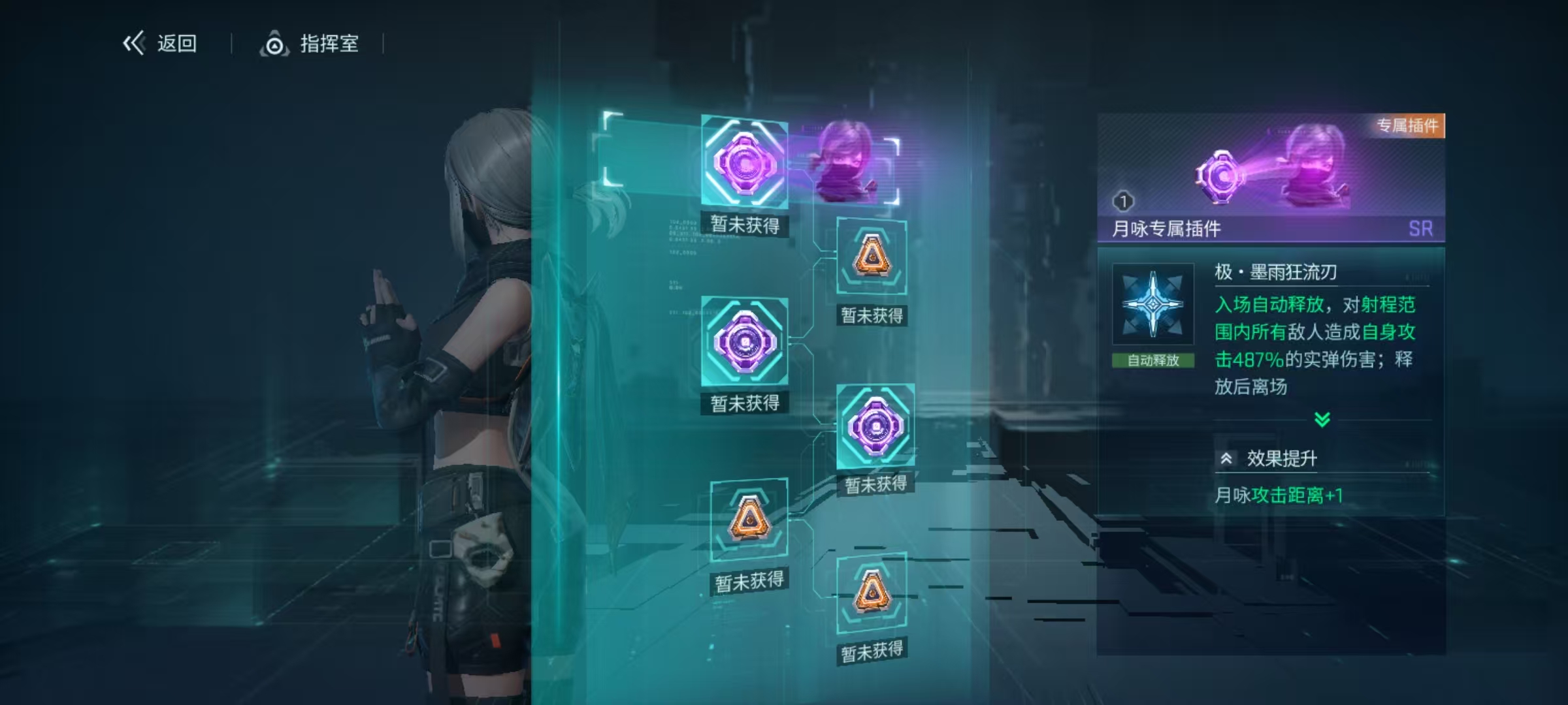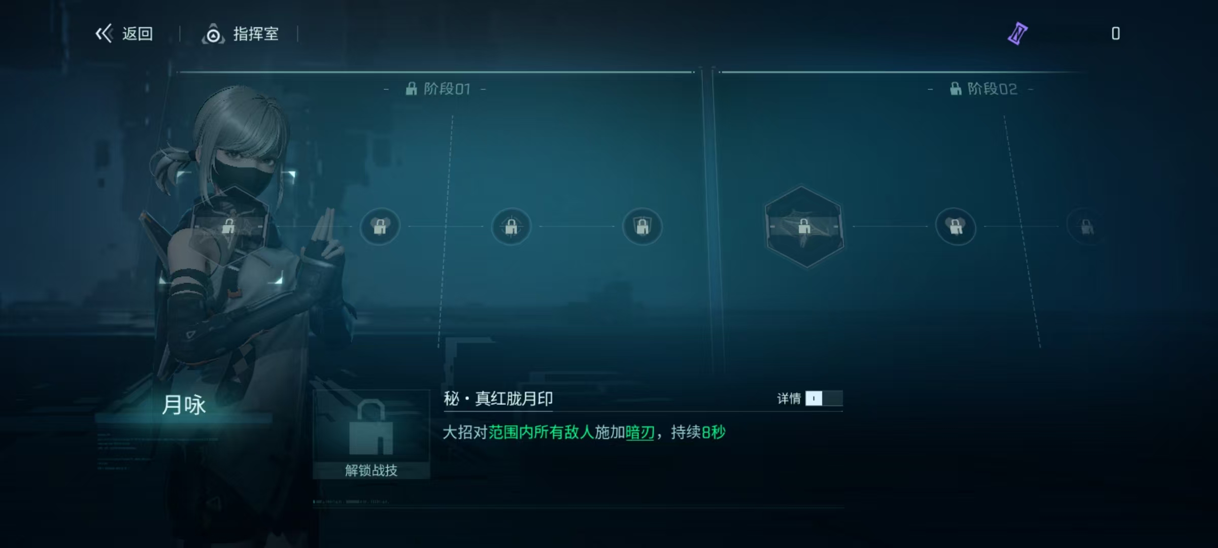 除了主动技能之外,还有两个被动,所提升的都是暗刃效果。当暗刃额外伤害触发时,还会触发溅射,直接伤害到其他被施加暗刃的敌人,暗刃的额外伤害触发几率获得提升,触发间隔缩短。月咏是属于群攻隐刃队员,在部署的时候应该尽可能的覆盖更多敌人。月咏对攻击过敌人会施加暗刃,队友的普攻或者是刀召唤单位,攻击都可以追加额外伤害,所以比较适合搭配侧击率高或者是能召唤单位的队友。
