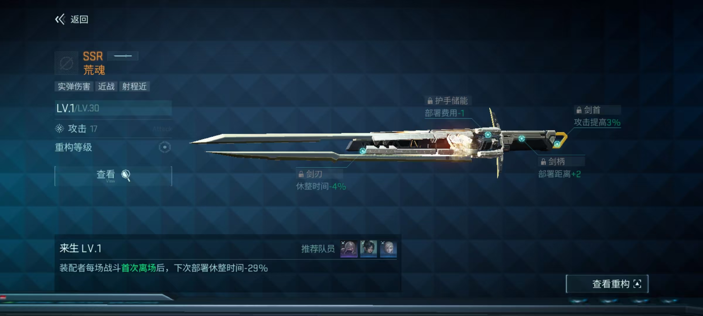 在武器方面推荐选择SSR品质的荒魂,这把武器的攻击距离比较近,特点是装配者每场战斗首次离场后,下一次部署的休整时间降低。如果暂时没有获得荒魂,也可以选择SR品质的境界,境界的技能效果是,装备者对每个目标的首次攻击,都能附加额外的电磁伤害。在阵容搭配方面,结合自身的技能效果,小编认为最适合配合的有以下几个,首先是召唤单位方面,包括梵妮、维希尔、格拉苏、金晶等。可以选择一些侧击辅助队友,例如夏帕特和赛卡卡,都是比较不错的选项。