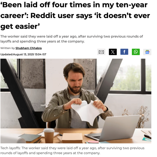 一位在十年职业生涯中经历四次裁员的科技员工在Reddit上分享了反复失业带来的情感和心理影响。“每次自己都被告知’这不是你的问题,只是商业决定’,”他说,”但当你看到自己的岗位被保留下来,甚至同事还能获得晋升,你很难不感到被背叛。”他现在依然受到精神焦虑与缺乏自信的困扰。