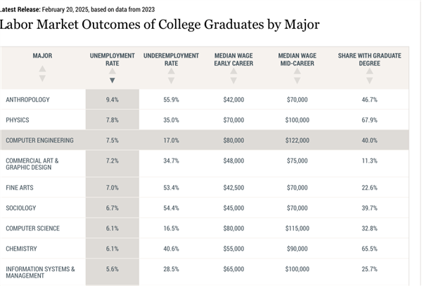初级软件工程师,现在是就业市场上的老大难。纽约联邦储备银行今年4月发布的《大学毕业生就业调查》显示:如今美国计算机工程专业的毕业生的失业率高达7.5%,在所有专业中排名第三,而计算机科学毕业生的失业率高达6.1%,甚至远远高于原本被认为不好找工作的艺术史和新闻学专业(分别为3%和4.4%)。