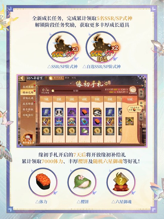 ※全新成长任务,免费领取5位SSR/SP式神,解锁阶段任务获取丰厚成长道具!