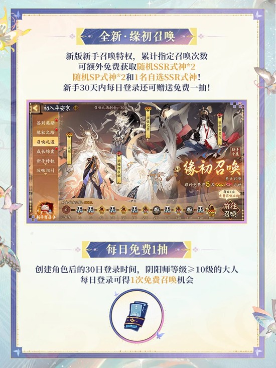 ※全新缘初召唤,30天内每日免费1抽,新手召唤特权可额外获取5位SSR/SP式神!