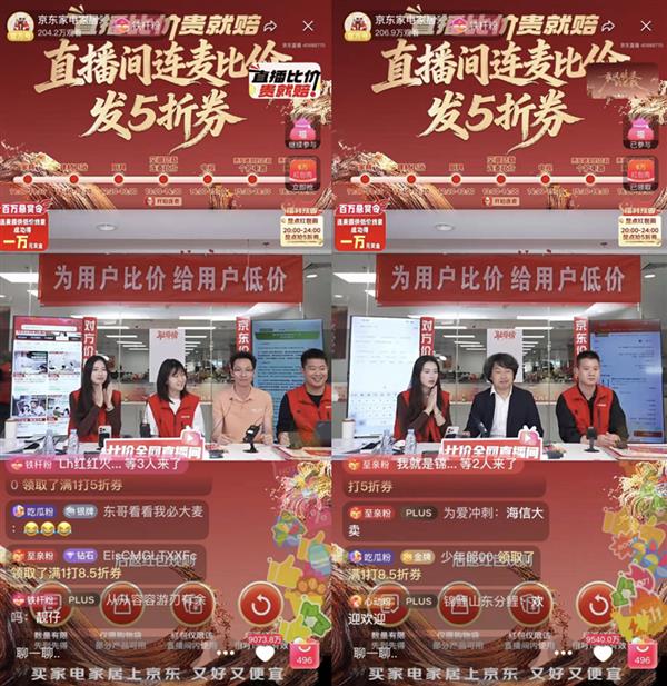与此前的比价直播不同,多位品牌大佬扎堆来到直播间,也让比价奖励全面加磅升级。在品牌高管做客直播期间,若用户连麦比价的是对应品牌商品,如京东自营价高,则提供低价线索的用户在获得1万元京豆奖励的同时,品牌高管将额外加磅赠送用户一件奖品,并会现场抽取10000元奖品福袋给直播间用户,同时比价商品也会现场调价至9折销售。直播过程中,品牌负责人也会不定时限量发放5折爆款商品,让更多直播间的用户可以享受到福利。
