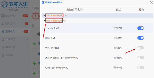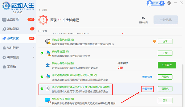2、在【系统优化】扫描结果页面滑动找到“建议对电脑的右键菜单进行个性化配置优化”点击“查看详情”界面,便可以看到右键菜单设置。