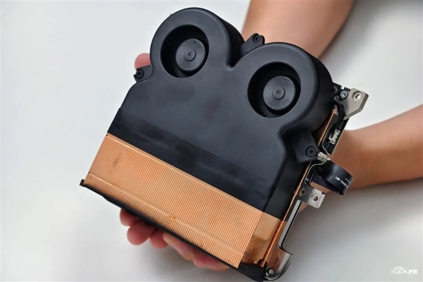 而为了镇住这颗性能猛兽,我们继续拆下主板后发现,主板后面贴着超级大的两个风扇散热单元,紧贴着三四厘米高的散热鳍片,这一套就占了主机内部一大半的体积,冷却配置堪称豪华,感觉全力工作起来可以把托尼吹走。