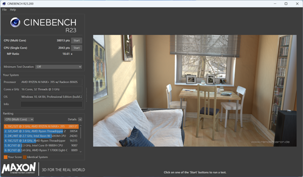 先给大家来几个基础的跑分开开胃 —— 在衡量 CPU 性能的 Cinebench R23 测试中,零刻 GTR 9 Pro 测得多核 38013 分,单核 2043 分,属于这个处理器的正常水平。