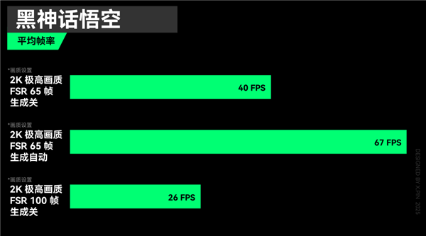 在同样经典的《 黑神话悟空 》环节,2K 极高画质 、 FSR 65 、帧生成自动的设置下,平均帧率 67 帧,但关掉帧生成再把 FSR 设置成 100 就有点为难这颗核显了,分别只跑了 40 帧和 26 帧。。。