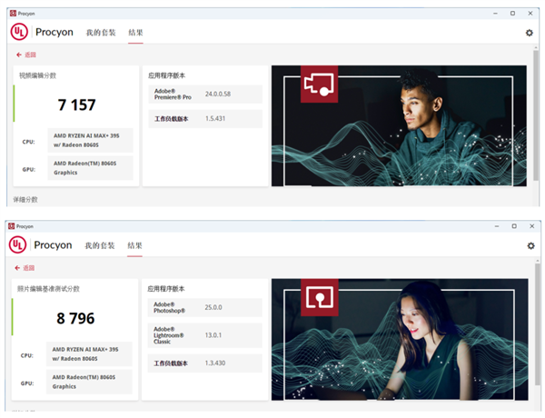 另外 GTR 9 Pro 的宣传不是还聊了一下设计生产力嘛,所以我们也顺手用 Procyon 给大家测了一波 Adobe 全家桶,实测视频编辑分数 7157 ,照片编辑分数 8796 。