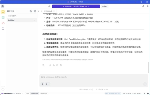 于是我们上来就尝试用 LM Studio 在这台机器上跑了 Deepseek-R1 70B 全参数模型,测得的速度是每秒 4.66 tokens ,也就是说一秒钟大概能生成四五个字,这个成绩已经是比较可用了。