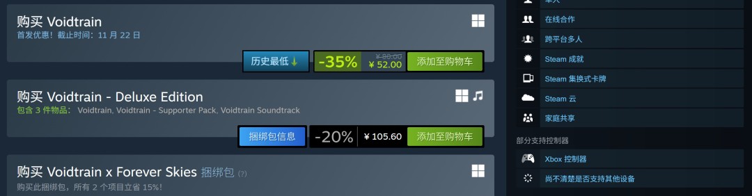 目前,《虚空列车》已在PC平台(Steam/Epic Games商店)正式发售。为庆祝正式上线,Steam版在11月22日前享有35%折扣优惠,售价为52元。
