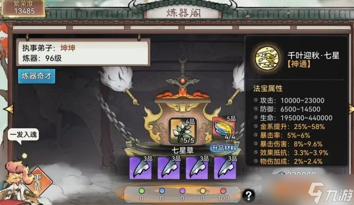 2、4阶法宝红藤炼制,选择4十3,5个四阶藤十4个3阶果,比起高配版少了百分5五行威力火,相应的补足法核所需要的效果命中属性。