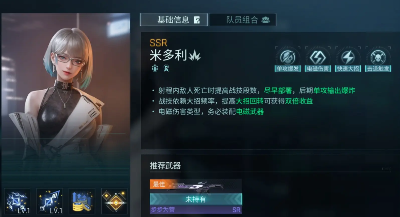 米多利属于电磁伤害类型,建议装配电磁武器,她能在射程内有敌人死亡的时候提升战技的段数,尽早对其进行部署,能让她后期的单攻伤害爆炸,不过她的战技会比较依赖大招的频率,注意提供大招的回转来获得双倍收益。
