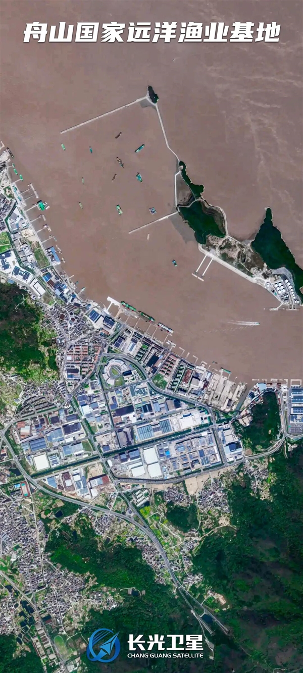 在卫星的广阔视角下,浙江舟山群岛展现出一幅自然风光、宗教信仰与现代经济交织的生动图景。