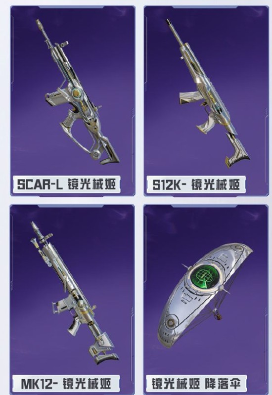 此次联名活动中,推出了两款全新角色皮肤——银色战姬和镜光械姬,以及多款武器皮肤,包括SCAR-L、S12K和MK12的镜光械姬系列。此外,还有配套的降落伞和不同级别的头盔皮肤,为玩家提供了丰富的个性化选择。