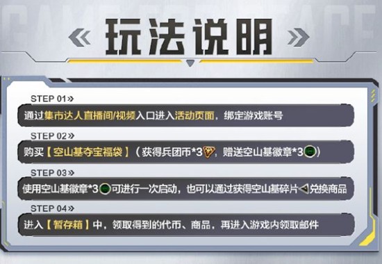 玩家可以通过集市达人直播间或视频入口进入活动页面,并绑定游戏账号。购买“空山基夺宝福袋”可获得兵团币和额外赠送的空山基徽章。使用空山基徽章可以启动活动,每次启动需要消耗3个徽章。玩家可以通过购买福袋或兑换空山基碎片来获取徽章。