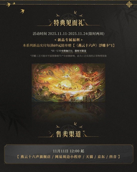 限时满赠:首发期(11月11日12:00-11月24日24:00)购买本系列新品实付金额每满69元赠限定《燕云十六声》浮雕卡*1张(同一订单可叠加获取,限时不限量)