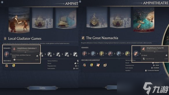 海战模拟:要求最高,需连通输水道系统,可获得军事单位强化与暴动预防等特殊效果