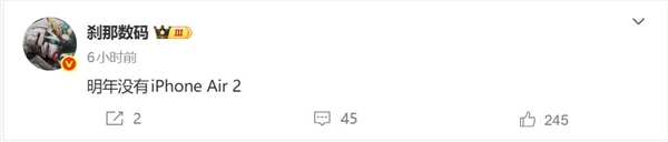 时间:2025-11-12 | 作者: | 阅读:011月12日消息,博主刹那数码爆料,明年没有iPhone Air 2。有网友猜测,iPhone Air 2可能会跟iPhone 18标准版一起在2027年上半年亮相。