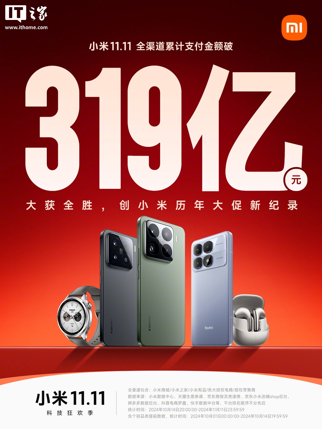 参考海报,相应“全渠道”包括小米商城、小米之家、小米有品、各大授权电商、授权零售商,统计时间为 2025 年 10 月 13 日 00:00:00 至 2025 年 11 月 11 日 23:59:59,含个别品类提前数据,统计时间为 2025 年 10 月 1 日 00:00:00 至 2025 年 10 月 12 日 23:59:59。