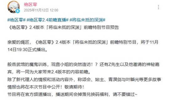 绝区零2.4版本将临未抵的深渊前瞻直播14日将开播