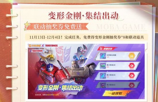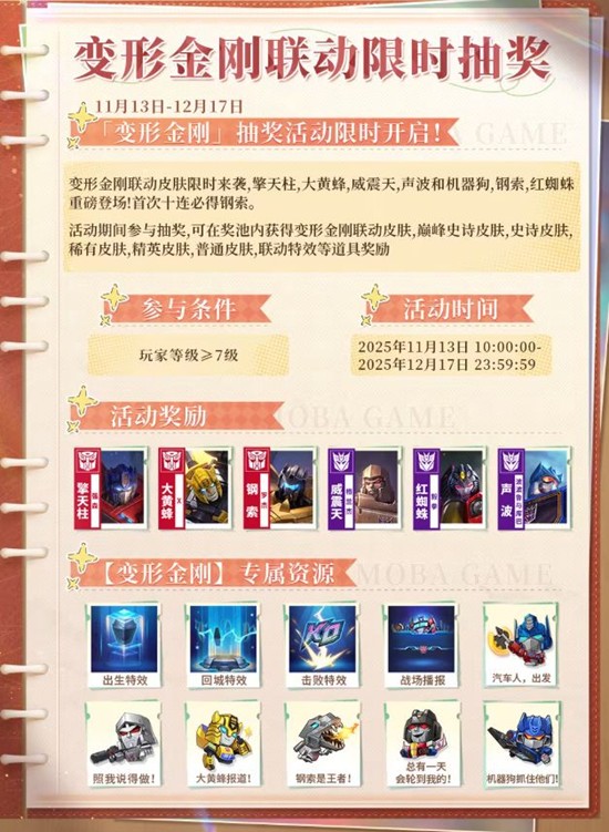 活动时间为11月13日至12月17日,玩家等级达到7级即可参与。在活动期间,玩家有机会获得变形金刚联动皮肤,包括擎天柱、大黄蜂、威震天、声波和机器狗等角色的皮肤,以及红蜘蛛等其他角色的史诗皮肤。此外,还有稀有皮肤、精英皮肤、普通皮肤和联动特效等道具奖励。