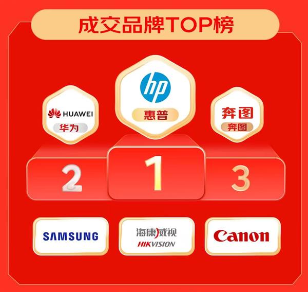 品牌方面呈现多元化格局。在成交品牌TOP榜中,惠普、华为、奔图位列前三,三星、海康威视、佳能等品牌紧随其后,共同构建起覆盖打印输出、智能安防、专业影像等多维场景的品牌生态,为政企用户提供更全面的商用设备选择。