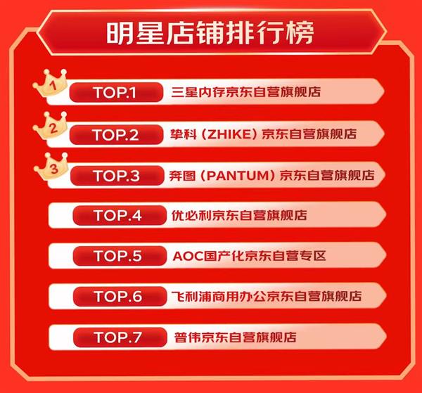 店铺侧同样表现出专业设备采购的集中化趋势。三星内存京东自营旗舰店、挚科京东自营旗舰店、奔图京东自营旗舰店位列排行榜前三,优必利、AOC国产化专区、飞利浦商用办公等京东自营店铺同样表现优异,整体反映出企业客户对专业化设备与京东自营服务的双重认可。