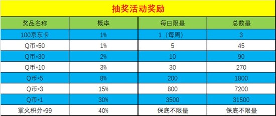 抽中Q币的概率很高哦,先到先得~各位CFer展现你运气的时候到了,活动奖励的概率如图所示,可以看到没有抽中Q币的CFer还可以获得掌火积分*99作为保底,可以在积分活动中兑换你想要的道具如钻石、改名卡、王者之骰等!