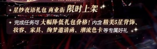 在星纱夜语礼包售卖期间,玩家们可以通过完成限定任务来获取礼包折扣。完成全部4个任务后,玩家们可以享受到最低2.2折的超值优惠。礼包内含限定五星背饰【夜纱织影】、五星妆容【烬色余痕】、精美家具【潮汐之泪】、绚梦邀请函3、体力300和潮流色卡*45,该礼包永久限购1次。
