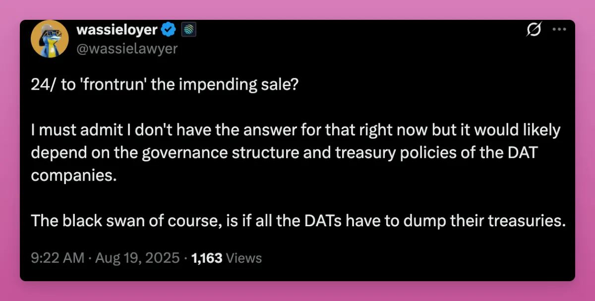 但就连 Wassie 也承认,当 mNAV 变为负值时,DAT 会发生什么情况仍不清楚。