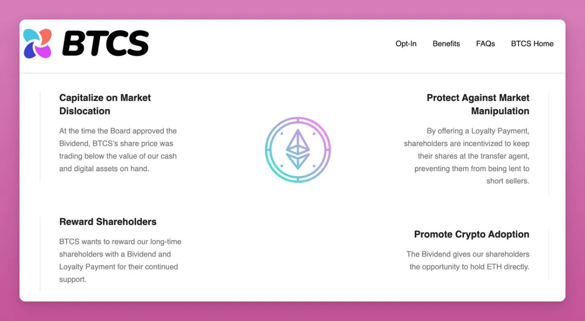 为了吸引更多的股票购买者,BTCS 宣布了第一个“双重分红”:一次性区块链股息,每股 0.05 美元的 ETH 股息和每股 0.35 美元的美元股息。