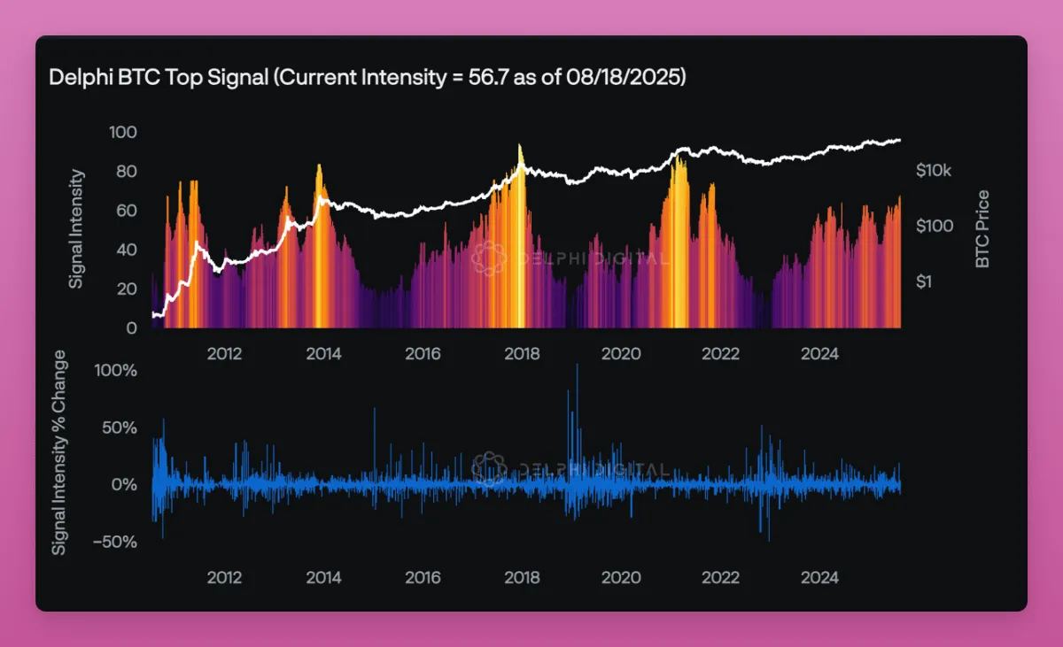 比特币正处于牛市的中期。持有者正在获利了结,但尚未出现极度兴奋的情绪。在估值过高之前,价格仍有上涨的可能。2、Delphi BTC Top信号