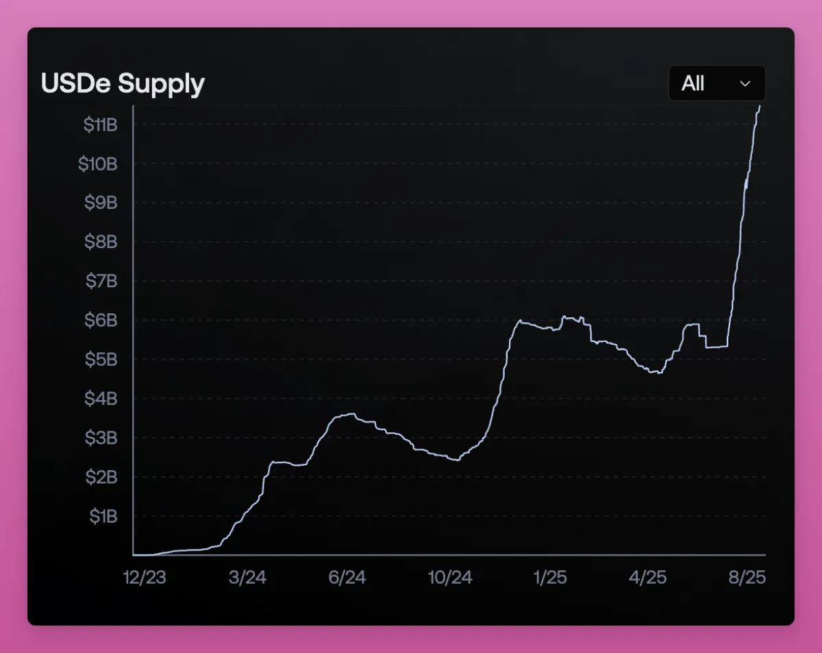 那么,如果我们不追踪融资利率,而是追踪 USDe 的供应量,会怎么样呢?在这种情况下,市场看起来很火爆。USDe 的供应量在一个月内翻了一番。