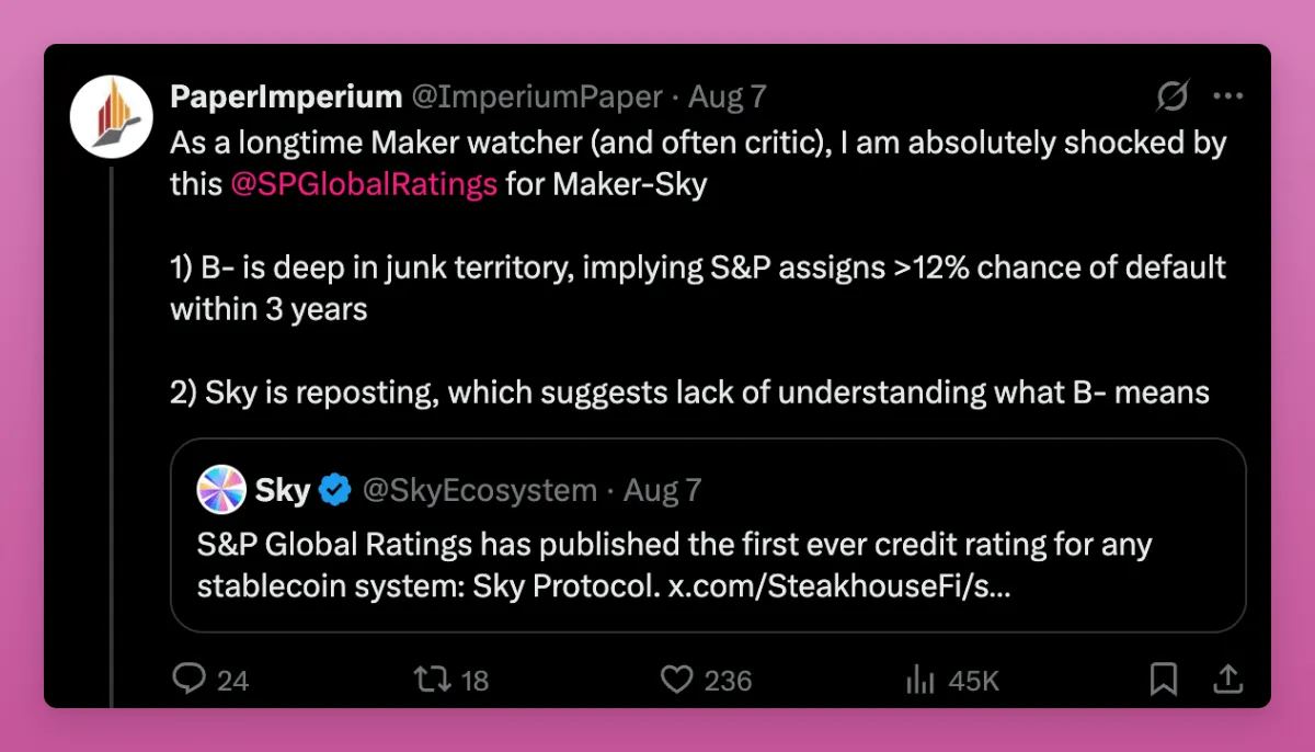 令我担心的是,标准普尔全球评级对Sky的B-评级是针对所有稳定币系统的第一个信用评级。