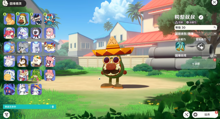 鳄梨叔叔属于物理输出型精灵,同时具备较强的生存能力,因此非常适合作为前排单位部署。其主动技能名为“鳄梨长腿输出”,释放后可提升自身12%的生命值上限,且该增益效果可随技能等级提升而叠加至更高百分比。更重要的是,这一增益将持续到战斗结束或角色被击败为止,属于长期有效的状态加成。当技能发动时,鳄梨叔叔的外形会发生显著变化:原本矮小的身躯会迅速拉长腿部,转变为高大形态,视觉冲击力十足。